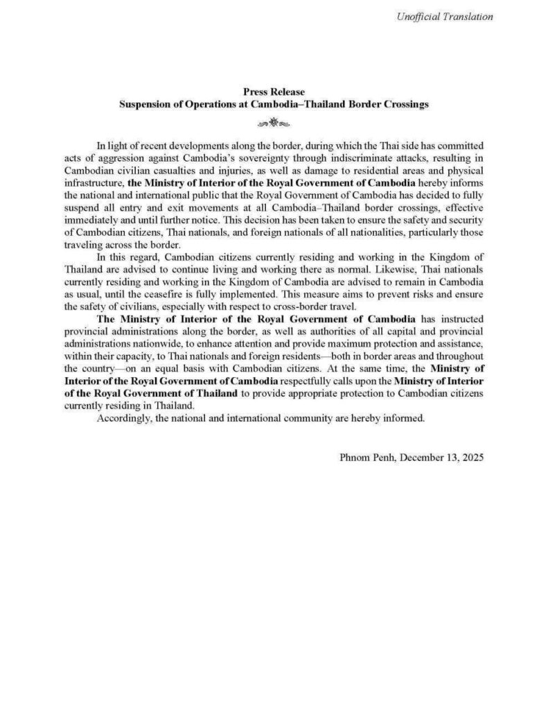 国境沿いにおける最近の情勢を踏まえ、タイ側が無差別攻撃を通じてカンボジアの主権を侵害し、カンボジア民間人の死傷者、住宅地やインフラへの被害が発生していることから、カンボジア王国政府内務省は、カンボジア王国政府がカンボジア・タイ国境検問所におけるすべての出入国を即時、かつ追って通知があるまで全面的に停止することを決定したことを、国内外に通知する。