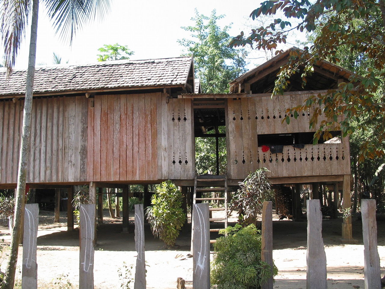 ◇モンクメール語族の先住民の古クメール族(高地クメー ル族ーモン・クメール族)がカンボジア中央低地帯の周辺の丘陵。高原地帯に散在し、東北部のモンドリキリ州やラタナキリ州では居住者のうち古クメール族が多数派を占めており、かつては狩猟や焼き畑を主としていた。先住民の住居はクメール族が主として高床式住居に住むのに対して掘っ建て式の住居である。また、古クメール族のなかには、鉄の掘り出しに特化したクイ族や野生象のを飼いならす種族を特技とする種族がいる。