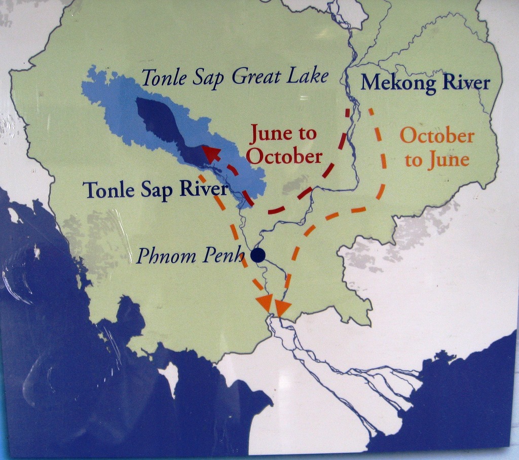 カンボジアの平野部はトンレサップ湖・バサック水系とメコン水系に二分される。トンレサップ湖は東南アジア最大の湖で雨季にはメコン川からの水がプノンペンでバサック川の合流点(クメール語:チャトムック)から水が湖に向かって逆流し、湖の面積を拡大する。2000年頃まで湖の水域は乾季の最小面積の3倍になると言われていたが、メコン川の上流部の中国、ラオスのダム建設よって、近年にはトンレサップ湖に流れ込むメコン川の水量が減り、湖や2つの水系でも漁獲量が減ったり、氾濫を利用した水田が使えなくなる、ベトナムでのメコンデルタで海進が進むなど環境の変化が大きな問題となっており、メコン川流域国が加盟するメコン委員会が加盟国の利害調整を図っているが、国家間の利害そのものとなるためその調整を難しくしている。
