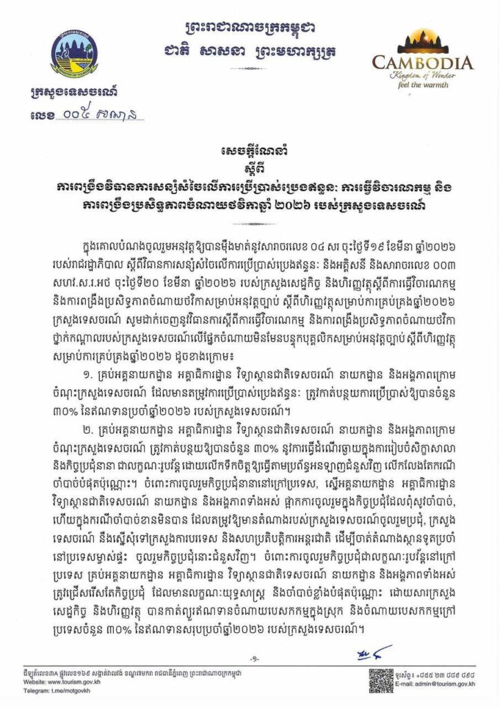 ニュース 経済・ビジネス 観光省が燃料使用量の削減を職員に指示 燃料ひっ迫は確実に 2026年4月6日 2026年4月4日 観光省は、2026会計年度の予算最適化と燃料節約に関する指示を発出した。 この指令によると、省傘下のすべての部署は、2026年度の予算配分額から燃料消費量を30%削減することが義務付けられている。 同省はまた、長距離移動を伴う対面式のワークショップや会議を30%削減し、可能な限りオンライン会議の利用を奨励するよう求めた。 会議への参加に正当な理由がない限り、不要な海外渡航は中止する。 燃料ひっ迫が確実視されているのであろう。 掲載写真:環境省 Khmer Times掲載 Facebook postはてブLINEPocketFeedly